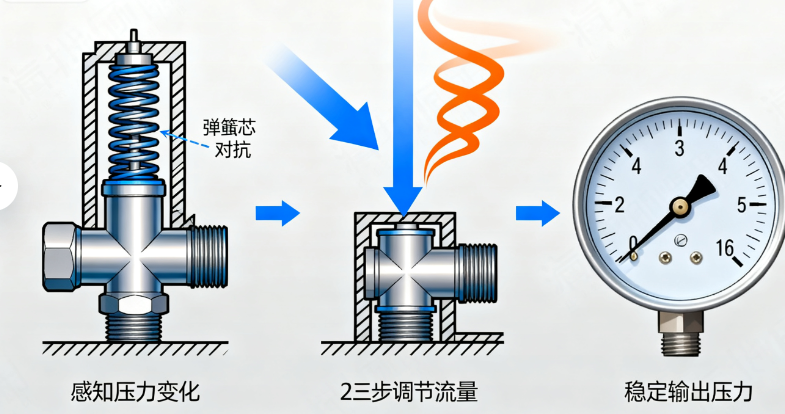 自動調節流量閥芯的開合程度會改變介質的流通面積 —— 閥芯開得越大,介質流通量越多,輸出壓力會降低;閥芯關得越小,介質流通量越少,輸出壓力會升高。通過這種 “動態調節”,抵消壓力變化的影響。